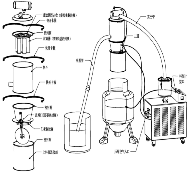 真空上料機的配件有哪些呢?哪些是常用配件,哪些配件不用常備,圓振機械來為您講述。首先先說明真空上料機的結構,如圖所示,真空上料機由真空泵、過濾裝置、卡盤、料斗、關門調速閥、氣缸、開...